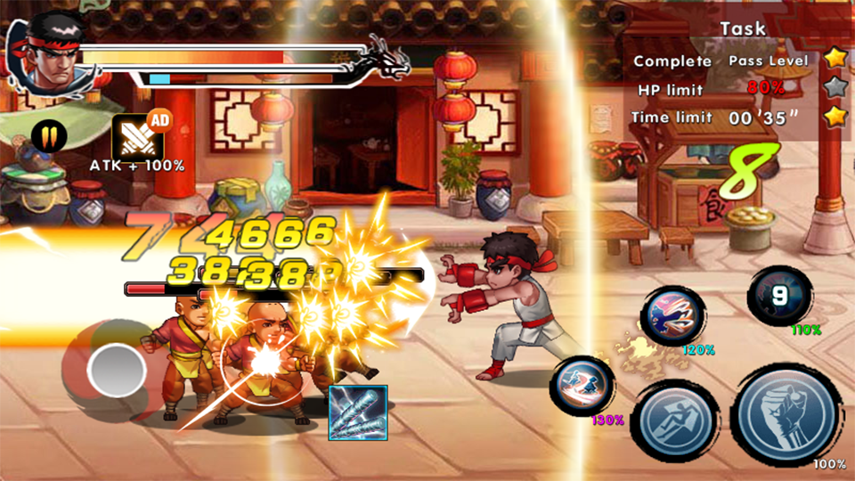 升級角色的生命值,拳法力量,踢法力量和武器技術,以擊敗更強的敵人。