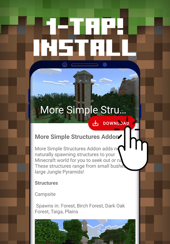 Structures Mod for Minecraft PE 是 Minecraft 袖珍版遊戲的免費可下載內容,您可以在其中自動下載大量結構和建築 Mod 並將其安裝到您的 Minecraft 基岩世界中,一鍵點擊!