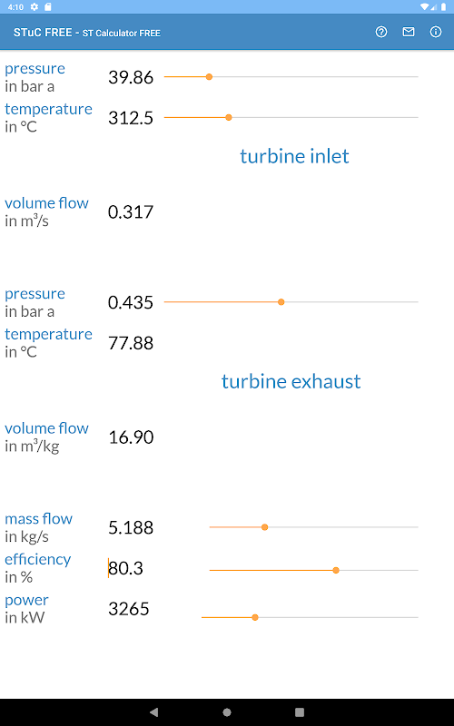 您可以透過應用程式滑桿輕鬆編輯邊界條件。對於每次計算,入口壓力、入口溫度和排氣壓力都是強制性的。可以計算渦輪機功率、體積流量和排氣溫度。