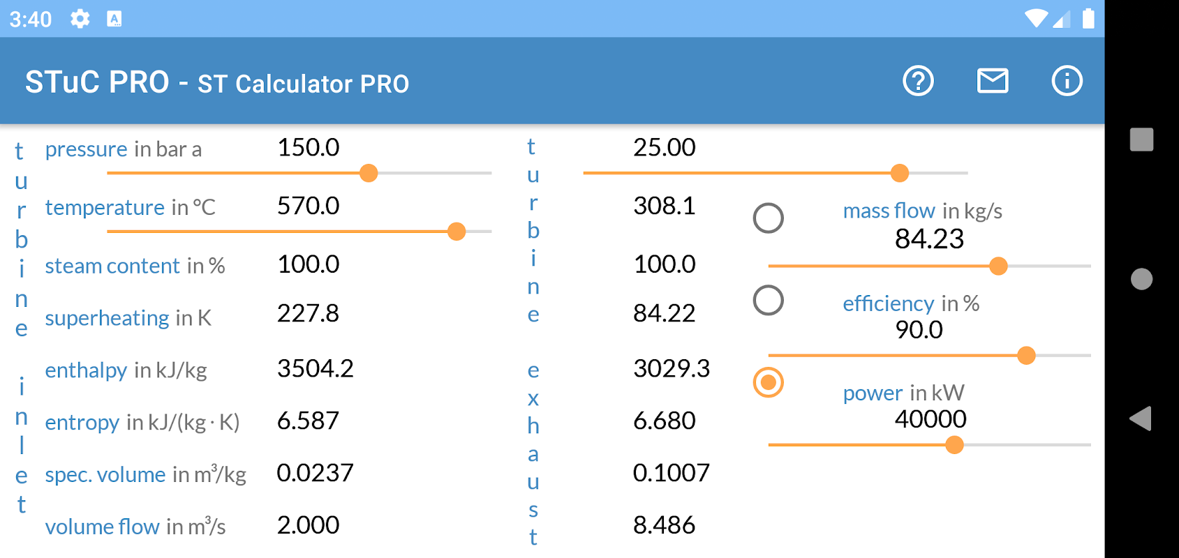 您可以通過應用程序滑塊輕鬆編輯邊界條件,也可以直接將其作為值輸入。對於每次計算,入口壓力,入口溫度和排氣壓力都是必需的。可以計算質量流量,效率或功率這三個參數之一。您可以在這三個參數之間切換。