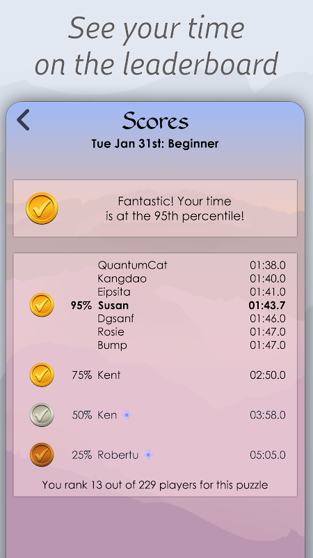 每天獲得功能Sudoku難題在你選擇的難度,它完成並提交你的時間,看看你如何與世界各地的30000其他球員誰已經享受這個每天面臨的挑戰進行比較。你能頂排行榜?
