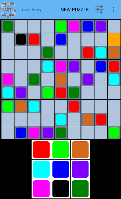 'Sudokuness'是基於邏輯的對象的放置的難題。目的是填補9×9網格對象,使每一列,每行,每個構成該網格包含每九個不同的對象的僅一次的九個3×3子的網格。它有3個級別的難度。在“Sudokuness”的對象可以是數字,字母,字符,表情符號或顏色。
