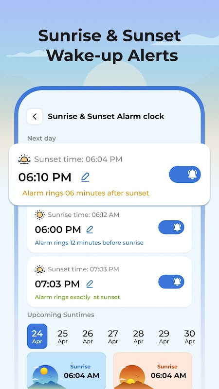 1. 日出和日落鬧鐘:直接在螢幕上了解當前和第二天的日出和日落時間表。查看未來 14 天即將到來的太陽時間。自訂您的鬧鐘以在日出前醒來或在日落前接收警報。使用者可以從三個警報選項中進行選擇:事件發生時、事件之前或事件之後。自訂鬧鐘聲音、啟用振動、設定貪睡時間以及從多個選項中選擇全螢幕桌布。