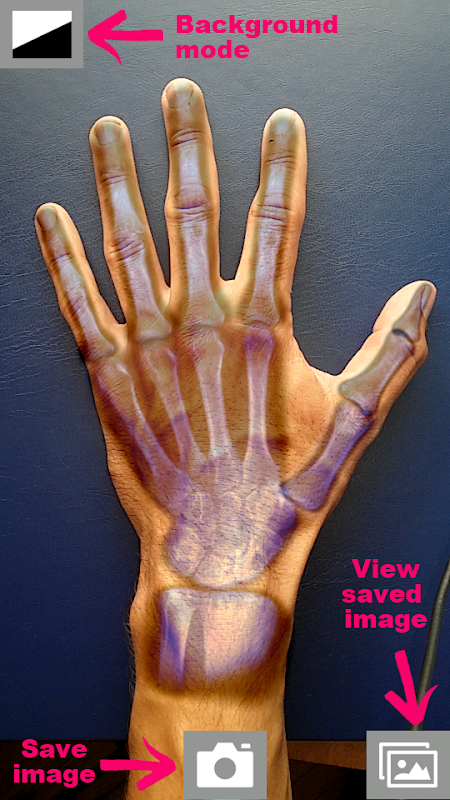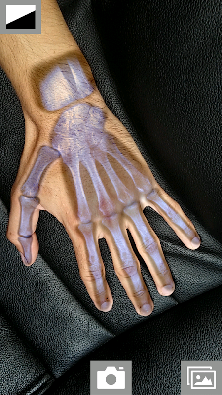 This app use video camera. Super XRay Camera shows xray scanning in real time video. With this app you can see the skeleton of the hand.