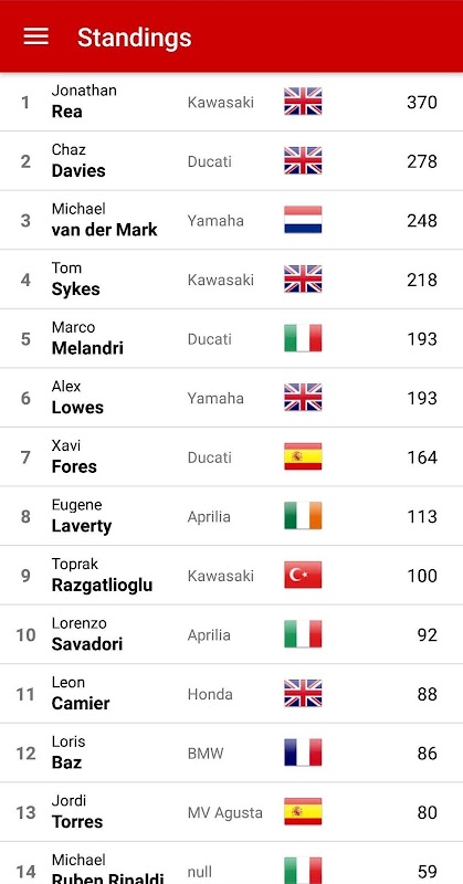 Get results for all racing events including free practices, qualifications, race and overall standing.
