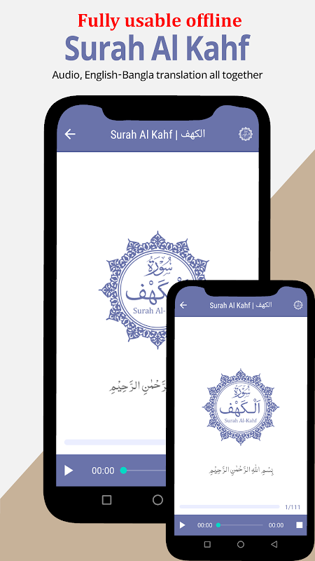 使用者在工作時可以在背景播放 Surah Al Kahf 的音訊。無需連接到互聯網即可使用此應用程式。