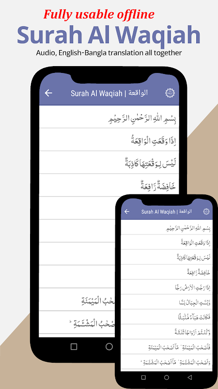 使用者在工作時可以在背景播放 Surah Al Waqiah 的音訊。無需連接到互聯網即可使用此應用程式。