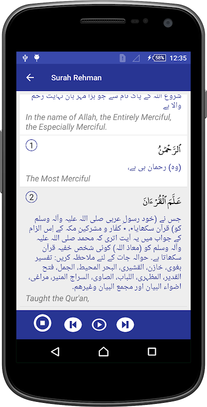 Surah rehman is known as beauty of holy Quran with 78 verses. In this application we try to give you best application which includes urdu and english translation with recitation of Mishary Rashid Alafasy voice. verse by verse recitation with highlighted text