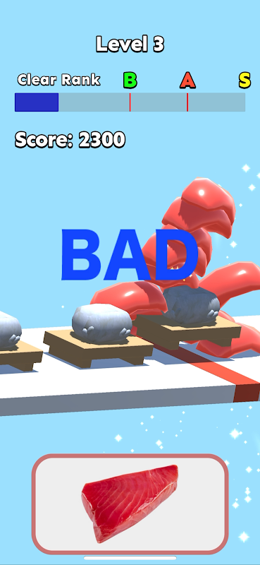 達到或超過目標分數後,舞台將被清除,玩家將根據他們的表現進行排名。排名系統範圍從 B 到 S,其中 S 是可達到的最高排名。該系統為遊戲增添了競爭優勢,鼓勵玩家提高技能並力求完美的壽司製作過程。