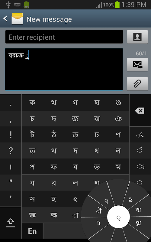 在孟加拉語中,我們經常需要輸入的組合A 輔音(ধ)和馬特拉(ো)像ধ + ো = ধো。當你觸摸一個輔音,輔音有10個經常matras組合和查克拉彈出(ধা,ধি,ধী,ধু,ধূ,ধে,ধৈ,ধো,ধৌ.. )。該輪給出了可能的字符組合的預覽。要選擇一個組合,滑動觸控筆或手指朝它。