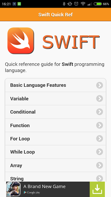 This app is a Quick Reference Guide for Swift Programming Language. The guide will be particularly useful for newbies who are trying to get themselves familiarized with Swift rules and syntaxes.