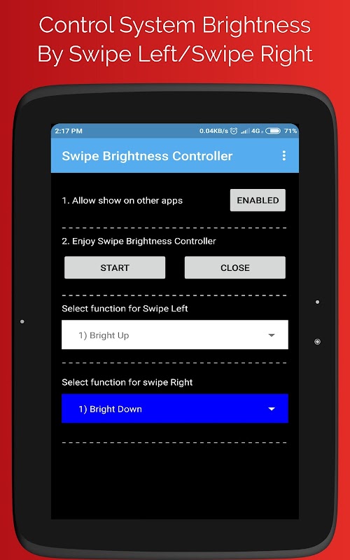 Swipe Brightness Controller is very useful app. You can Increase/Decrease Brightness quickly with swipe left,swipe right..