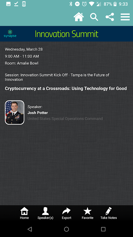 The Synapse 2018 Innovation Summit mobile application allows you to view the schedule, presentations, exhibitors and speaker details from the conference. Users can take notes adjacent available presentation slides and draw directly on slides inside of the app. Note-taking is also available in the posters and exhibitors modules.