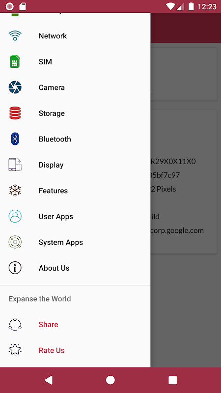 處理器,CPU,RAM,存儲,相機,電池,網絡,Wifi,SIM,藍牙,顯示,屏幕分辨率,Gps,Nfc,Ub,傳感器,麥克風,根,Bootloader,CDMA,GSM,指紋,VOIP,音頻和視頻支持信息,相機場景模式,相機框架和分辨率,方向,膨脹軟件,默認應用程序,系統應用程序,用戶安裝的應用程序,Mac地址,SSID,鏈接速度,IP地址,OTG設備信息,電池電壓,電池運行狀況,電池類型,操作系統版本,主板,製造商,型號