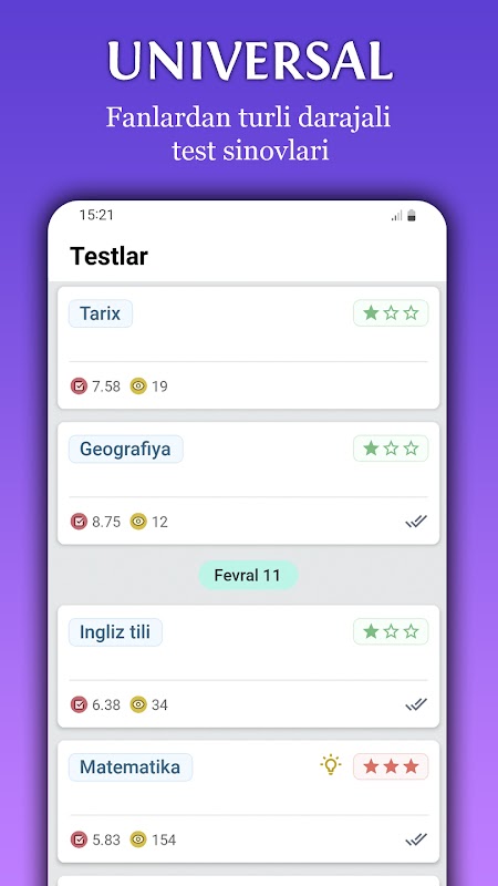 Mutaxassislar tomonidan ishlab chiqilgan kontentlar yordamida imtihonlar va olimpiadalarga puxta tayorgarlik ko‘ring。 Siz uchun chuqur tahlil qilingan Materiallar va real testlarga mos mashg'ulotlar taqdim etamiz。
