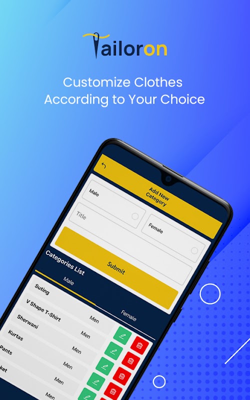 Tailoron 移動應用程序是在考慮到此類業務的需求後進行深入研究而設計和開發的。對於希望使用此應用程序建立在線裁縫業務的任何人來說,這可能是一個不錯的選擇,因為它允許企業添加他們提供的服裝系列和款式,然後最終用戶可以使用此應用程序在線定制,如在這個應用程序的演示。此應用程序具有如下所述的一些出色功能,可幫助任何潛在企業通過此經濟實惠且全面的系統開展業務。
