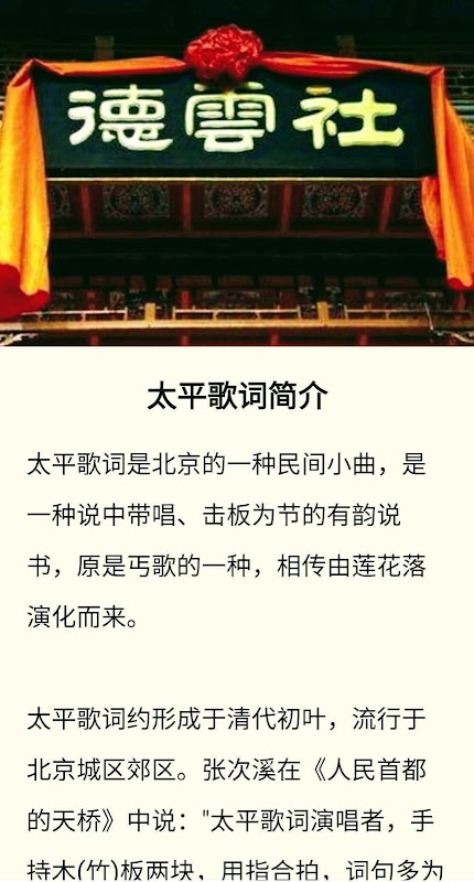 太平歌詞是一種從屬於相聲的曲藝形式,約形成於清代初葉,從北京的民間小曲演變而來,一直被作為相聲的四門基本功之一,德云社的火爆進一步推動了太平歌詞的發展。除此之外應用戶要求,還有一些其他的傳統曲藝。