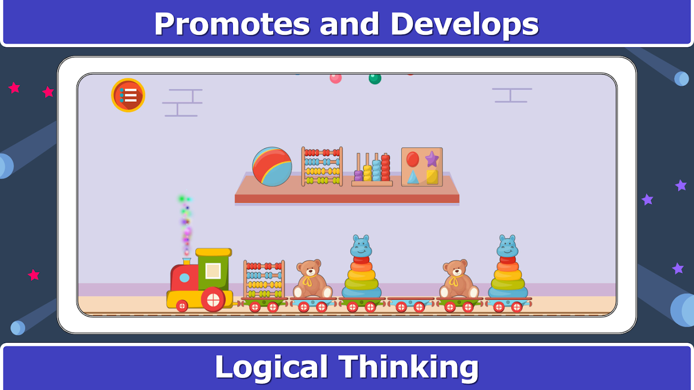 該應用程序提供多達 30 項教育活動 (*),通過匹配不同形狀、顏色和大小的對象,幫助他們發展認知、分類和精細運動技能。