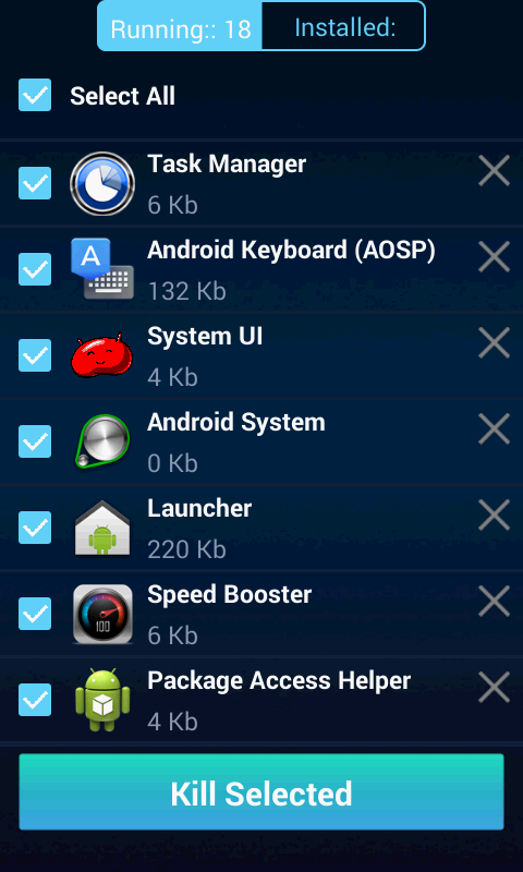 One-tap System Speedup will boost the phone for you in an instant. Just tap on that button, and Task Manager will automatically scan your running processes, kill or restart apps hogging system resources, free memory and make your phone more responsible.
