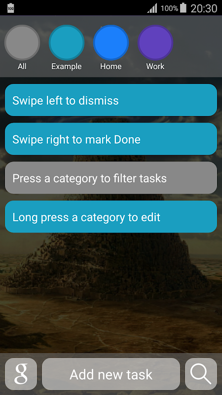 You can easily create new tasks, mark them complete and delete them. Group your tasks in categories, so you can filter them or search in them to find the ones what you are searching for easily.