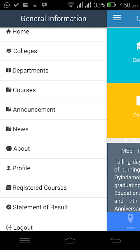 The mobile app provides access to updated news and annoucements from the university website. It also provides general information on Colleges, Departments and Courses run in the University. From the courses, app users can view the course content and connect the profile of the assigned lecturer. Students can login on the mobile app with their account credentials on the TASUED TAMS portal (my.tasued.edu.ng) to access their respective course form and results for all the registered sessions.
