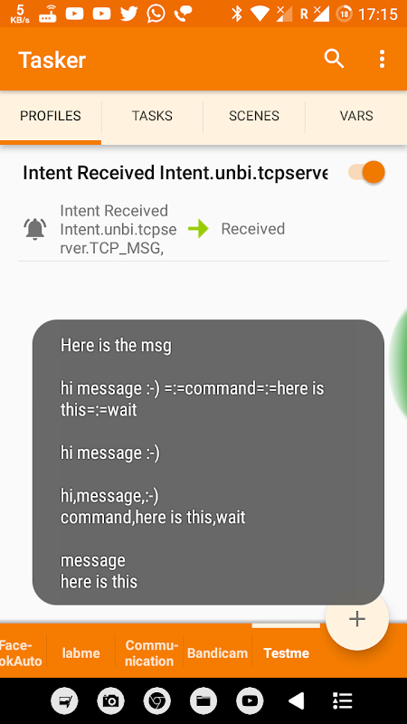 This app will send an Intent to the Broadcast Receiver whenever a message is receive in the its TCP server port. This can trigger tasks in Tasker app.