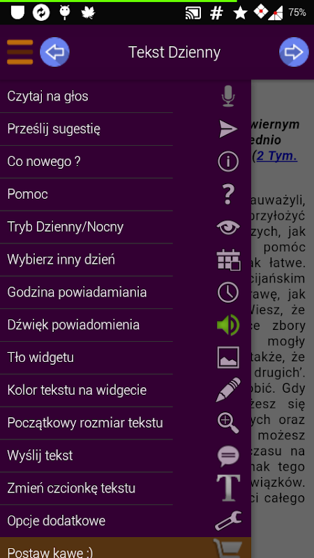 - Aplikacja przypomni (o ustalonej godzinie) za pomocą powiadomienia na pasku statusu o nowym tekście dziennym do przeczytania gdy zmieni się data (z dźwiękiem lub bez).