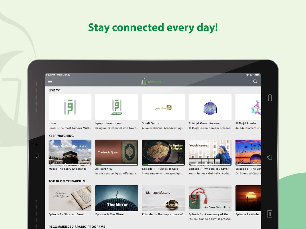 Telemuslim的創建是為了使世界各地的穆斯林能夠可靠,安全地訪問100%家庭友好的伊斯蘭內容和電視節目。它還為與親朋好友分享和發現伊斯蘭文化和習俗提供了絕佳的機會。保持與伊斯蘭文化的聯繫,學習阿拉伯語,教育孩子,娛樂和啟發– Telemuslim始終對整個家庭都是安全的。