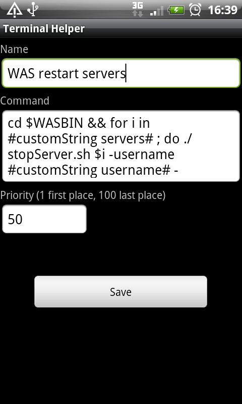 DO NOT USE ENTER in Command! This application is designed to help people working with SSH/ConnectBot/Terminal applications with possibility paste something into it. You can make list of often used long commands here and then map Terminal Helper to some shortcut key on your keyboard, and pick any of these commands just with one click to your clipboard. Also, you can use word #customString# somewhere in your command line (so many times, as you wish), and Terminal Helper will ask you for replacement every time before copying command to clipboard. More information and complete guide on website.