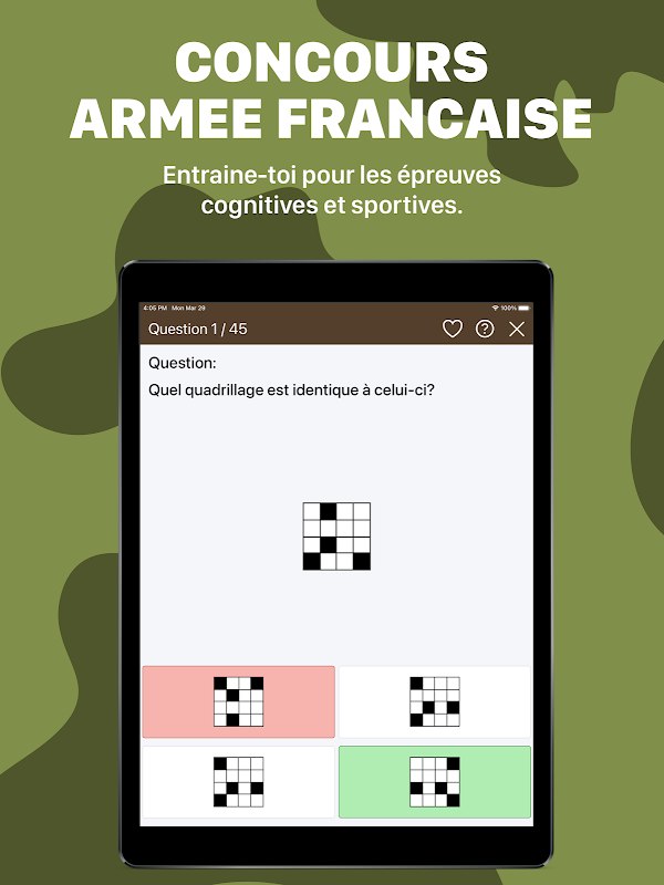 注意:我們不隸屬於陸軍或國防部。該應用程式滿足了考生準備能力傾向測驗和體能測驗的需要。測試可能隨時變更。請參閱法國陸軍的官方網站和您的 CIRFA 顧問以了解更多資訊。