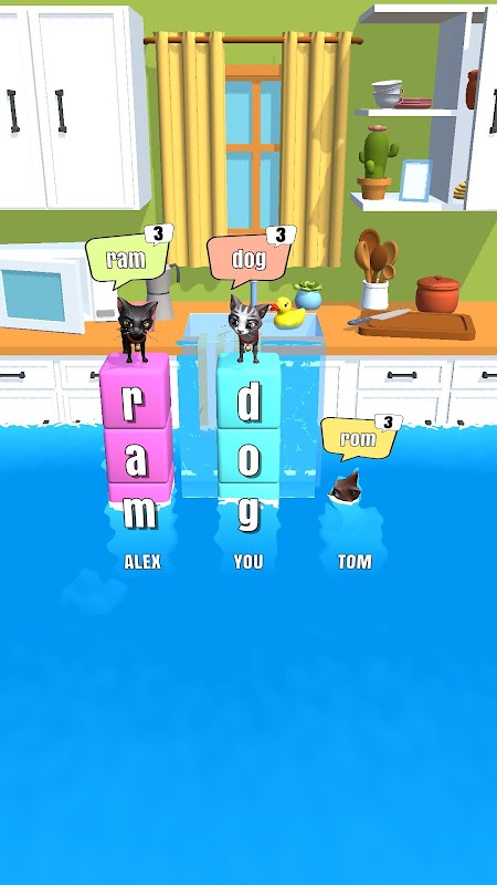 Help the cats to escape the flood in the kitchen by entering the names of the animals at each stage of the level. The longer the word, the more blocks you get and your cat will be able to win!