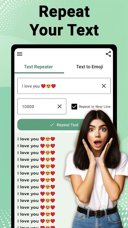 這個文字重複器:重複文字和表情符號應用程式非常有趣且引人入勝,您將創建獨特的訊息,重複您的文字並將聊天中的單字轉換為表情符號。用不尋常的文字圖案和獨特的文字設計以及他們從未見過的其他重複文字設計來表達您的感受並給您的朋友帶來驚喜。透過重複輸入多次「對不起」或「我愛你」來表達情感。