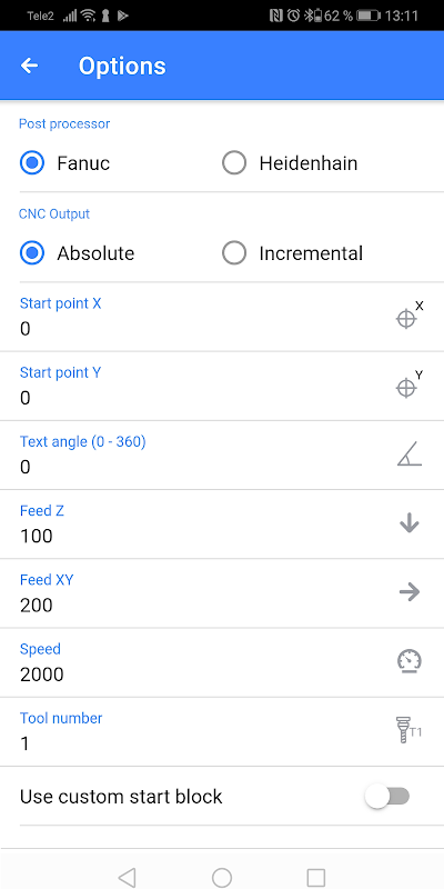Generate engraving texts in G code for your CNC machine. It has never been easier to create a standard engraved text. Specify: Text, Height, Width, Font, Depth and the app generates your text in ISO (Fanuc/Haas) G code. Preview and sharing features are included.