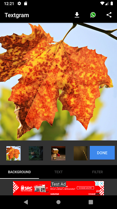 In the menu FILTER Textgram - Text on Photos, you can filter your text that you created with beautiful filter. Very easy to use, only click on the filter that you want and you can see the applied filter instantly.