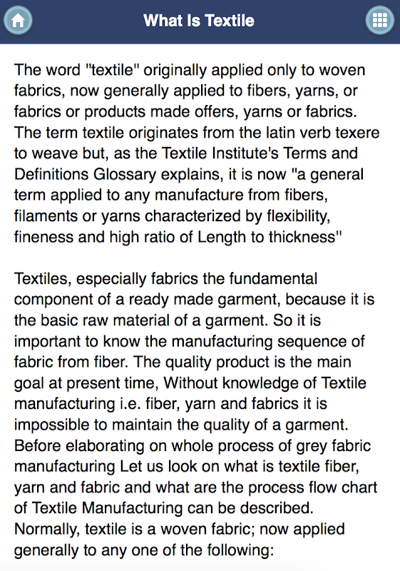 Boys and girls who have interest to know about textiles mechanism, textile manufacturing process, machinaries involved or the raw materials used to manufacture a cloth, dyeing or printing a cloth or sewing it for end usages; this Android App can be a life saver for them.