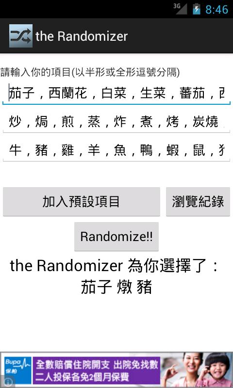 生活充滿抉擇,你還在想吃什麼茶餐廳碟頭飯,買什麼顏色皮包,抑或星期六要去哪裡玩?你只要下載the Randomizer,進入後輸入所有要抽選的項目,the Randomizer就會隨機抽選出其中的一個,適合患有選擇恐懼症人士使用。