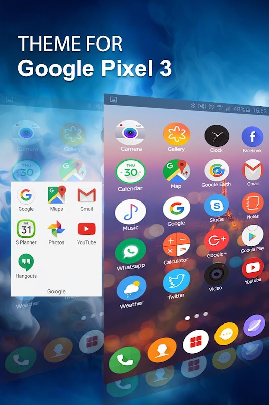 Google Pixel 3為您的主屏幕,相機,社交網絡,娛樂,商務,健康,聯繫人,電話,智能手機,娛樂,新聞,廣播,輔助功能,天氣,地圖和導航提供定制的新主題和圖標。