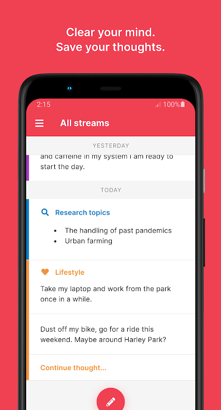 保持頭腦清醒,並迅速將思想保存到數字意識流中。思想流旨在作為散亂思想和沈思的垃圾場,將為您提供釋放那些隨機但可能有價值的思想所需的空間,以便您以後再使用。
