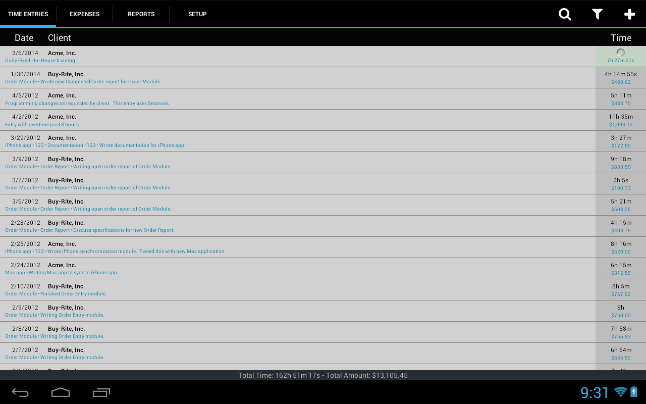 Time Master 可以跟踪時間和費用。您可以使用開始和停止時間、持續時間和/或計時器來跟踪時間。所有時間條目都跟踪一天,因此時間條目不能超過 24 小時。它將允許您跨天工作,例如,如果您在晚上 8 點開始工作。並在凌晨 2 點結束,它將持續 6 個小時。