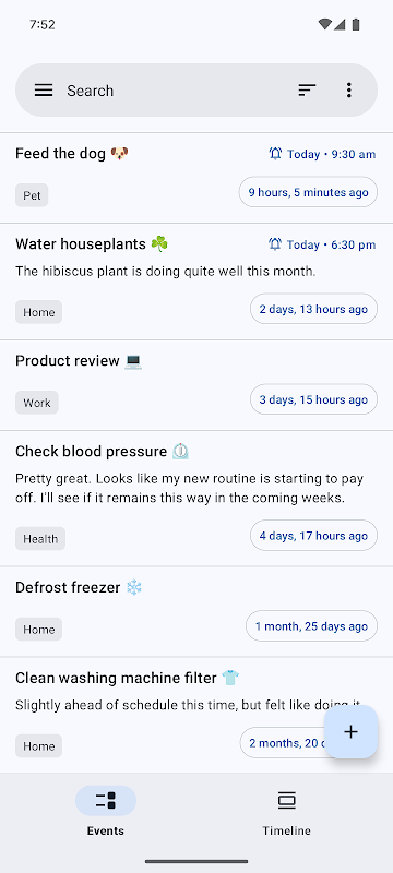 在每個事件條目中新增註釋和照片。查看條目之間的時間以及每個條目創建以來的時間。按日期範圍或註釋搜尋條目。