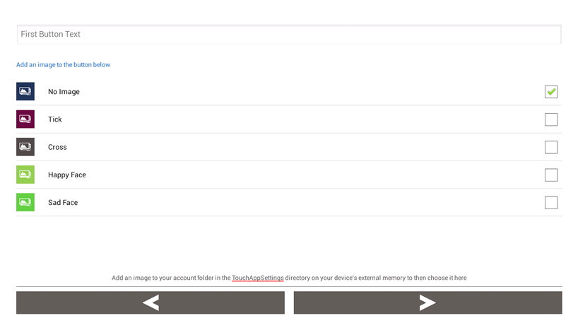 New images can be added to the app, following the creation of a user account, by placing them within the user's account folder located on the device's SD card at .../TouchAppsSettings/AccountName