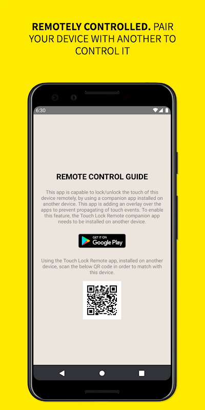 *** Another device is needed in order to remotely lock/unlock the touch screen on the main device. Tutorial: https://www.youtube.com/watch?v=wc74vf6Tdjs Remote app needed on the remote device: https://play.google.com/store/apps/details?id=com.touchlock.newremote