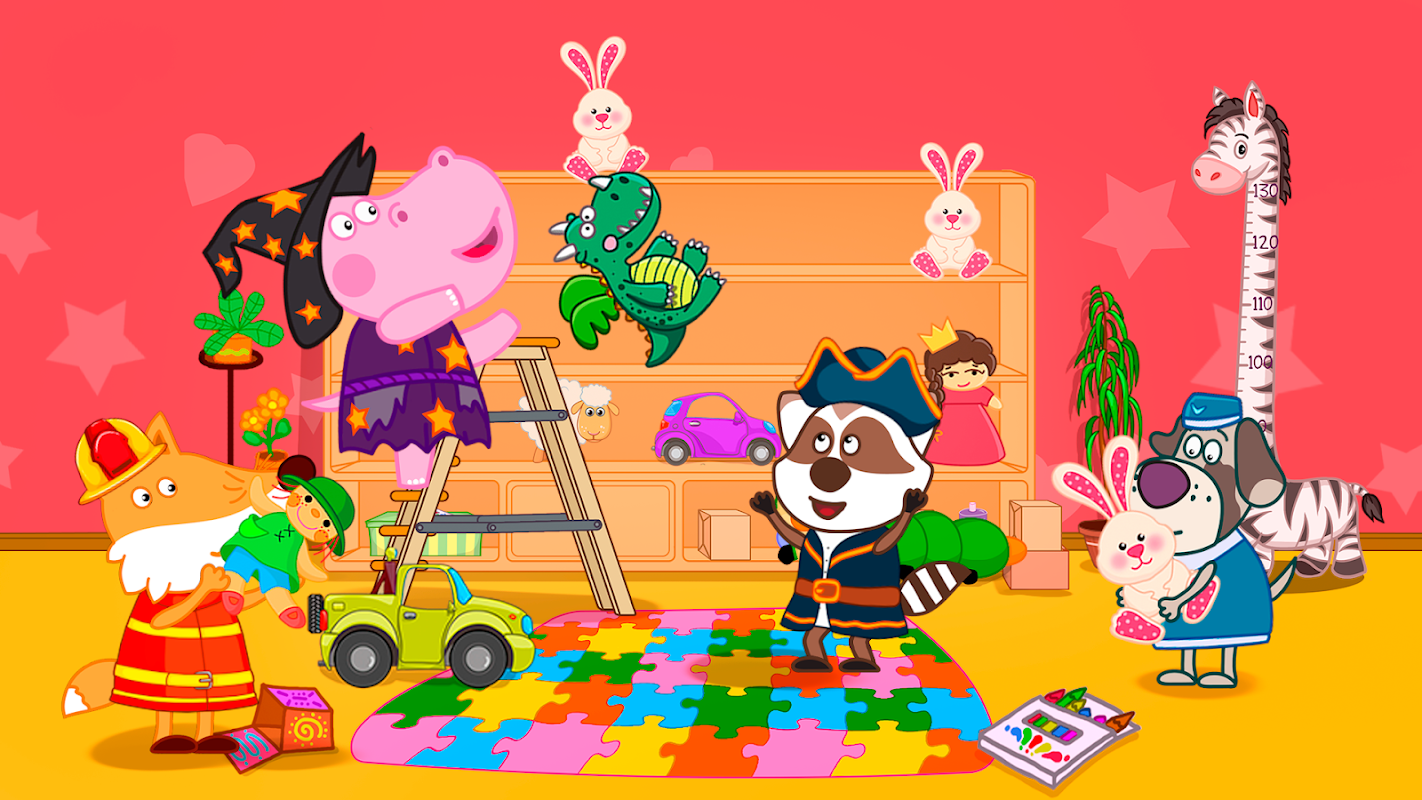 讓我們在這個關於商店的兒童遊戲中開始一場激動人心的冒險,河馬和她有趣的朋友們在托兒所裡開了自己的玩具店。 我們的主角河馬和她的團隊將學習如何銷售、購買和管理一家玩具店,他們將培養學習顏色、數數和在貨架上尋找物品的技能。 小玩家遇到顧客,會幫他們找東西,清點一切,找零錢。 小玩家將幫助河馬和她的朋友們管理玩具店。