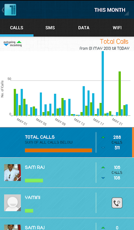 1). Shows daily/weekly/monthy/custom-period overview of CALLS, SMS, MOBILE DATA USAGE, Wifi Usage with detailed information on count and timing of CALLS/SMS to every contact & Data Usage of every app.