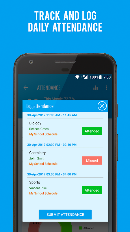 登錄您的日常課堂出勤。用漂亮的圖形和圖表,通過過濾時間表,類或日期可視化你的考勤數據。