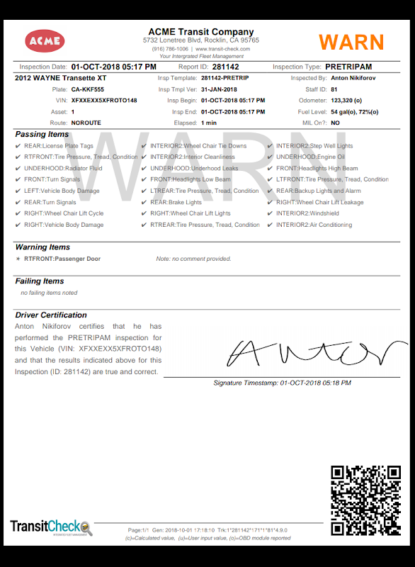TransitCheck 是一個整合系統,由雲端儲存、平板電腦應用程式和入口網站組成,適用於需要行前、行後、駕駛員交換、維護和安全檢查的車隊。此系統管理檢查、基本維護、報告和其他選用功能,包括車輛位置、駕駛員管理和事件報告等紙本表格的自動化。客戶可以隨時透過易於使用的入口網站完全自訂檢查,無需額外費用,並且每輛車可以有無限數量的檢查類型。