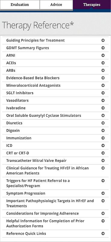 本應用程式的內容源自 2022 年 AHA/ACC/HFSA 心臟衰竭管理指南、2023 年 ACC 射血分數保留型心臟衰竭管理專家共識決策路徑以及 2024 年 ACC 射血分數降低型心臟衰竭治療專家共識決策路徑。本臨床決策支援應用程式中的資訊和建議並非唯一或最佳的治療方案,也不代表臨床判斷。治療方案應由患者與其醫護人員討論後確定。