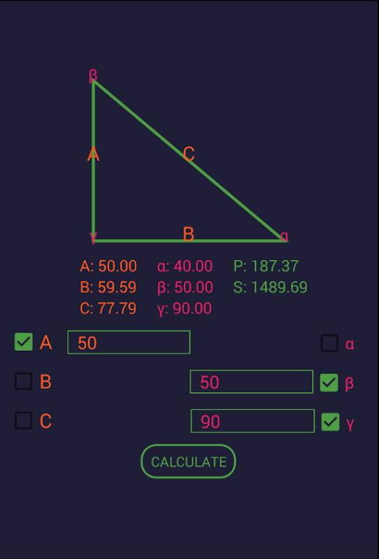 A simple application for calculating the angles and sides of an equilateral, equilateral, right triangle on existing sides and corners, as well as calculating the area and perimeter with a clear graphic display!