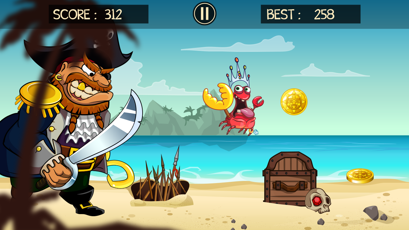 You are a little greedy crab and one pirate is trying to catch you with his gold. Run as fast as you can to escape your fate as long as you can in this engless runner.