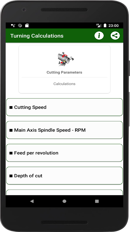 The application allows the user to calculate the Cutting Speed, RPM, Cut Time, Taper Turning, among others ...